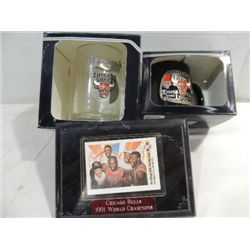 LOT 3 CHICAGO BULLS BASKETBALL COLLECTIBLES: 2 MUGS & 7X5 PLAQUE 1991 WORLD CHAMPIONS CARD. AS SHOWN. VIEW PICTURE FOR DETAIL.