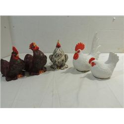 LOT 5 CONTEMPORARY CERAMIC ROOSTER & HENS. THE WHITE SET IS LEFTON. AS SHOWN. VIE WPICTURE FOR DETAIL.