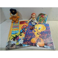 LOT 5 CHILDRENS TOYS: MARVEL LARGE MULTI-GAME BOARD, TWEETIE BIRD POSTER, GARFIELD PLUSH DOLL, JELLY BEAN DOLL. AS SHOWN. VIEW PICTURE FOR DETAIL.