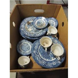 LOT 39 VINTAGE STAFFORDSHIRE IRONSTONEWARE, LIBERTY BLUE CHINA. 15 DINNER PLATES, 7 COFFEE CUPS, 11 SAUCERS, 6 DESSERT PLATES. AS SHOWN. VIEW PICTUR