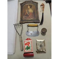 LOT 7 VINTAGE ITEMS: METAL MID CENTURY CIGARETTE CASE & LIGHTER, VEGETABLE CUTTER, OLD MASHER, SHOE HORN, PRESSED METAL WOOD MATCH HOLDER AND PI...