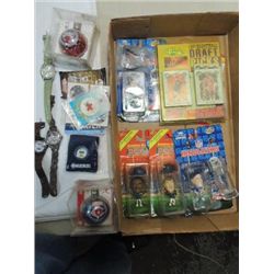 BOX LOT SPORTS COLLECTIBLES: PEZ DESPENSER, BEARS MINI HELMET, POCKET WATCH, AND MUCH MORE. AS SHOWN. VIEW PICTURE FOR DETAIL.