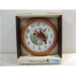 2003 STONEY CREEK DECORATIVE WALL CLOCK 11"D. CARDINALS. AS SHOWN. VIEW PICTURE FOR DETAIL.