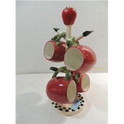 NEW NEVER USED MUG STAND & FOUR APPLY SHAPED MUGS. AS SHOWN. VIEW PICTURE FOR DETAIL.
