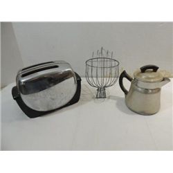 LOT 3 VINTAGE KITCHEN COLLECTIBLES: GENERAL MILLS TOASTER, MONTGOMERY WARDS ALUMINUM COFFEE POT, WIRE FRAME EGG BASKET. AS SHOWN. VIEW PICTURE FOR D