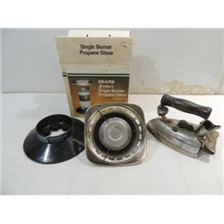 LOT 2 SEARS SINGLE BURNER PROPANE CAMP STOVE & 1930S HOTPOINT ELECTRIC IRON. AS SHOWN. VIEW PICTURE FOR DETAIL.