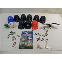 JACK POT LOT ASSORTED SPORTS ITEMS: MINI BASEBALL HELMETS, FOOTBALL PLAYERS FOR THE FIBRATING BOARD GAME AND MUCH MORE. AS SHOWN. VIEW PICTURE FOR D