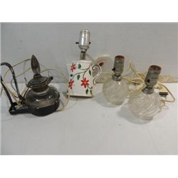 LOT 4 VINTAGE LAMPS: 1 CERAMIC WALL LAMP, 2 GLASS