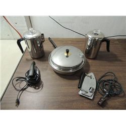 LOT 5 KITCHEN WARE: 2 STOVE TOP COFFEE POTS, 1 STAINLESS STEEL FRYING PAN, 2 VINTAGE IRONS. AS SHOWN. VIEW PICTURE FOR DETAIL.