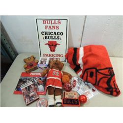 LOT 18 CHICAGO BULLS COLLECTIBLE: BLANKET, 6 LICENSE PLATES, 2 ORNAMENTS, PLUSH STUFF BEAR AND MORE. AS SHOWN. VIEW PICTURE FOR DETAIL.