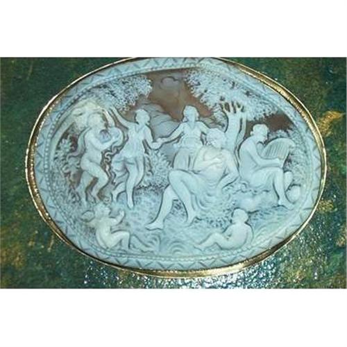 This stunning carved cameo measures aproximately 4 1/2 inches by 2 1/2 inches. The carving is beautiful. A garden scene with muses and cupids and goat men dancing under the trees. The frame appears to have a 14 k hallmark.
