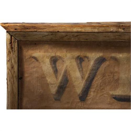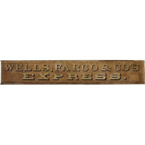 <B>HUGE WELLS FARGO & COMPANY EXPRESS CANVAS SIGN. 1870'S</B></I> - Very rare Wells Fargo & Co. Express sign: 12 ft. x 2 ft. From the <B>William Parker Lyon</B></I> collection (sign marked on back, Lyon & 1873) Pasadena/Arcadia, California. This beautiful hand painted white with black highlights sign was a merchant's sign, probably from the Gold Rush Country. This merchant just did not have the money for a beautiful reverse glass sign of the time. This is one of the largest Wells Fargo California signs still in existence, it is a museum showpiece. <BR><BR><B>Condition:</B></I> This is very unusual to find a sign this size in very fine condition; canvas & paint are excellent for period.<BR><BR><b>Shipping:</b> Requires 3rd Party Shipping (<a target="_blank" href="http://www.heritageauctions.com/common/shipping.php">view shipping information</a>)