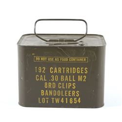 Included in this lot we have a unopened .30 caliber M2 ammunition tin. The tin contains 192 cartridges of .30-06 rifle rounds for the M1 Garand and is