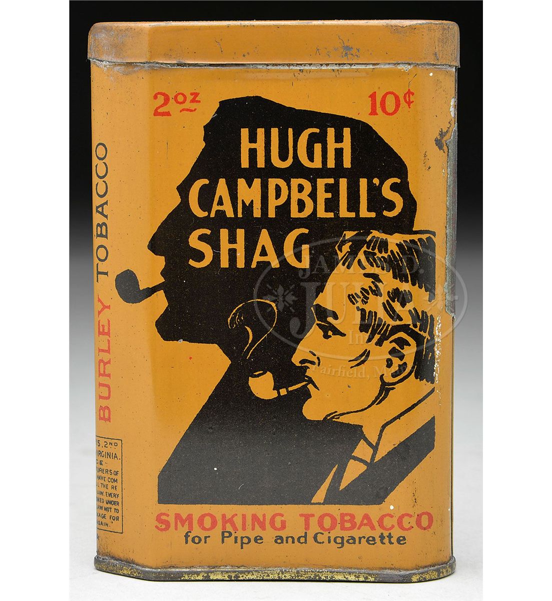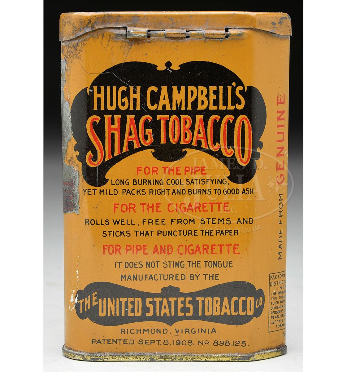 Shadow graphic of gent smoking a pipe. United States Tobacco Co., Richmond, Virginia. SIZE: 4-1/2" t. CONDITION: Top right corner of lid and tin has some light abrasions, otherwise grades near excellent. 1-13226-9