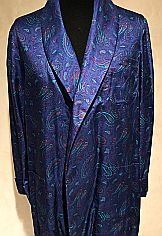 THIS HANDSOME PAISLEY IS VERY FINE SILK WITH MATCHING BELT AND AN ELEGANT SHAWL LAPEL.