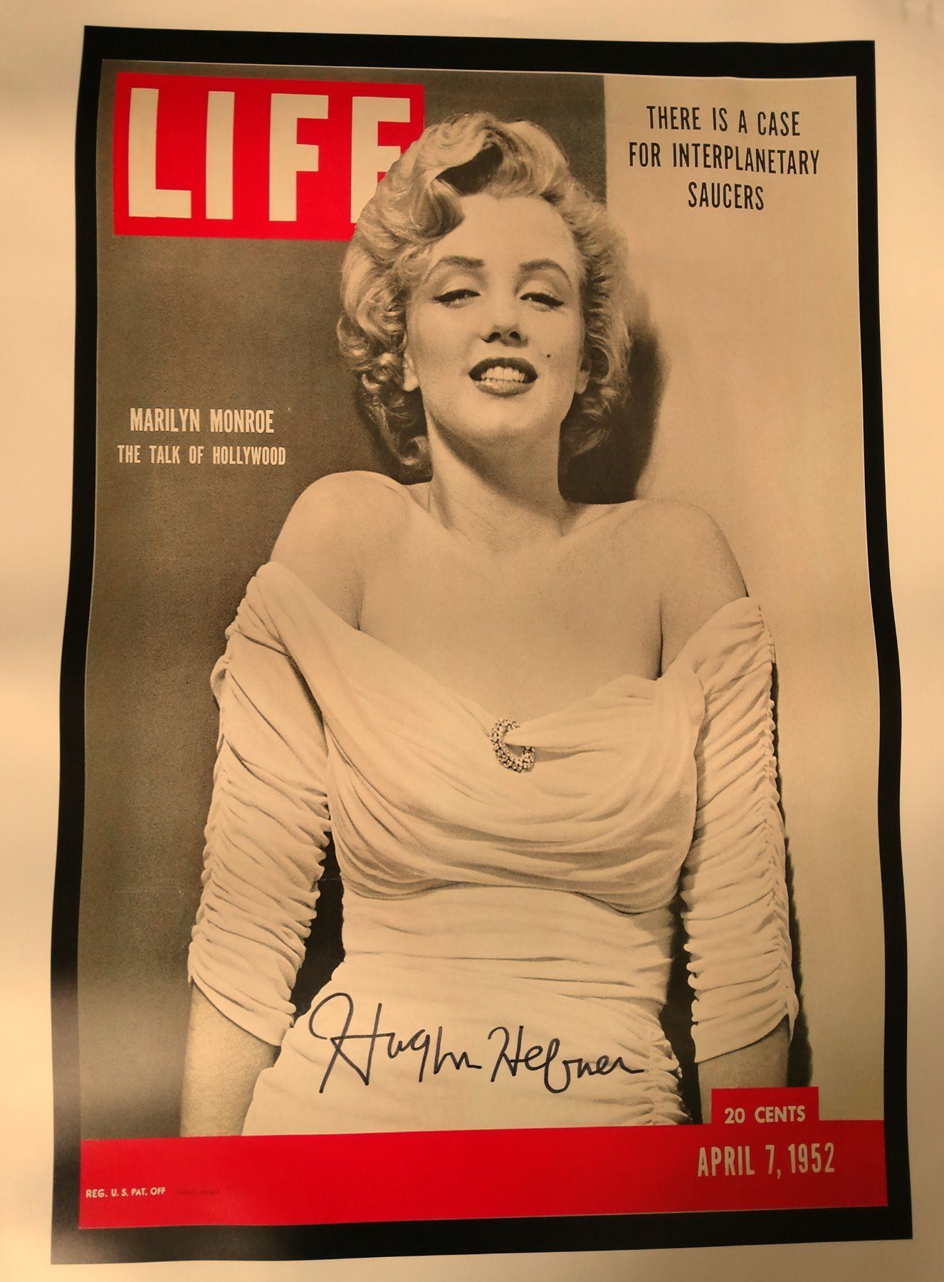 A reproduction poster of Marilyn Monroe for Life - her 1st national pose for a major magazine company. Signed by Hugh Hefner in sharpie. The poster with white borders measures 34.5x24 inches. The quality of the print is poor.