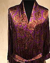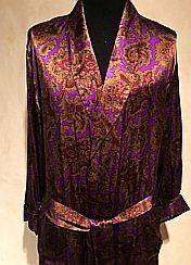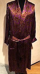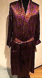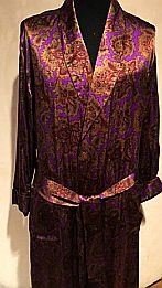 THIS HANDSOME PURPLE PAISLEY IS VERY FINE SILK WITH MATCHING BELT AND AN ELEGANT SHAWL LAPEL.