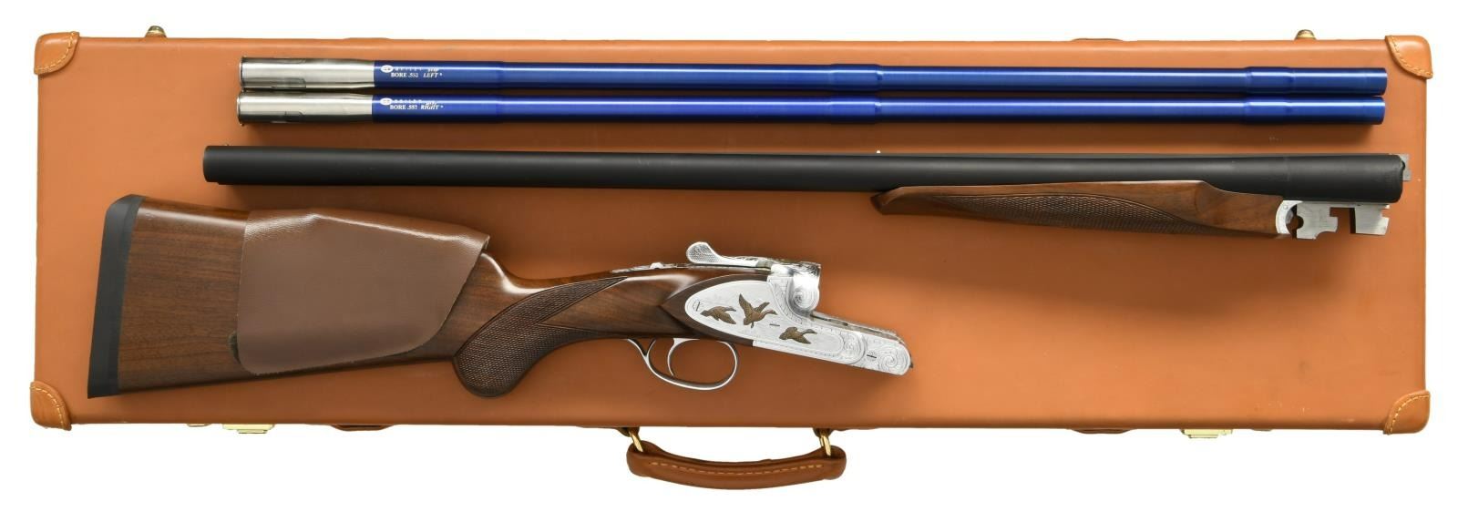 CASE. Cal. 12 GA, 3". S# 04C2432. Bbl 28". De Haan Model S2 side by side shotgun manufactured by HUGLU of Turkey. The polished stainless steel receiver features a matching engraved game scene with 3 bronze inlaid ducks, with the remainder of the receiver exhibiting scroll engraving. Underside of receiver is engraved "De Haan/ Model S2". Tang pattern barrel and safety selector switch. Barrels exhibit a matte black finish, being currently equipped with removable Improved Modified (Left) and Full (Right) chokes, and featuring a solid rib with a brass bead front sight. Right side of barrel bears the caliber designation at the breech, with "Made in Turkey" on the left and HUGLU's manufactured information on the underside. Checkered rounded knob buttstock featuring an adjustable velcro cheek rest, with a checkered beavertail forend. UNATTACHED ACCESSORIES: browning pattern brown leather case containing assorted chokes and accessories. Also included is a Briley 28 GA drop in bore set. CONDITION: very good overall, with metal components retaining the vast majority of their original factory finish, exhibiting some mild superficial marks from handling and storage. Mirror bores, exhibiting some light firing residue. Wood furniture shows some scattered marks from handling and storage, but is otherwise very good. Case and Briley drop in tubes are very good overall. (23-2359/MLW). MODERN. $500-900.