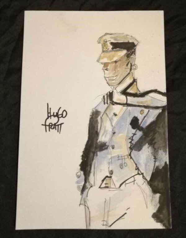 Hugo Pratt, was an Italian comic book creator who was known for combining strong storytelling with extensive historical research on works such as Corto Maltese. The drawing measures 13.25x9.5 inches. Signed, and is mounted and framed and supplied with coa.
