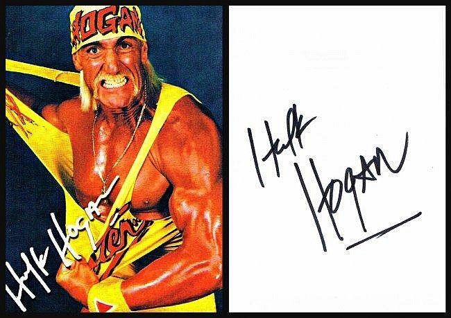 A HULK HOGAN SIGNED CARD. A HULK HOGAN SIGNED PICTURE A colour picture of Hulk Hogan on the front of the card with a presigned autograph. And on the back of the picture Hulk Hogan has signed his autograph in black sharpie