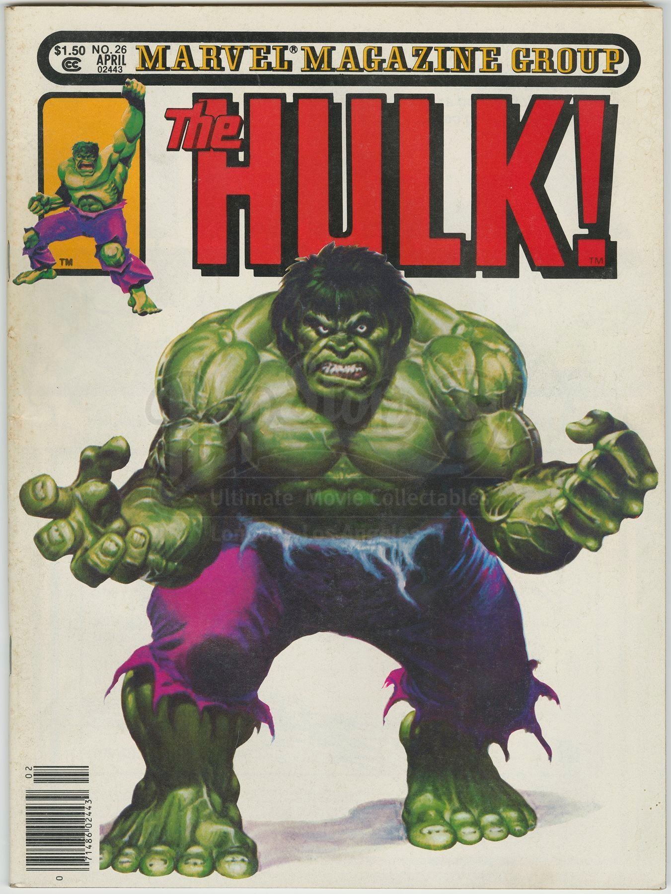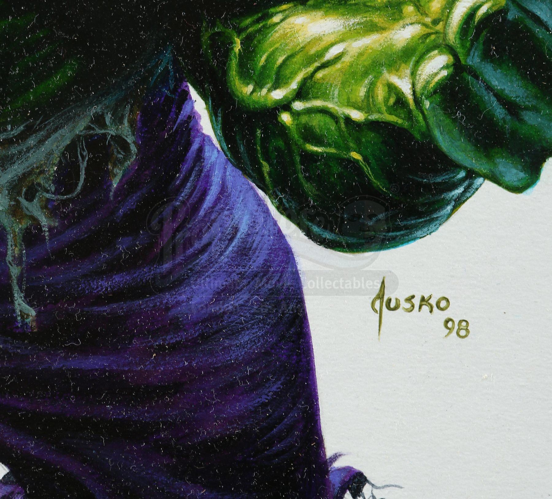 The artwork is rendered in acrylics on oversized illustration board and shows the Hulk poised to attack. The artwork is signed “JUSKO 98” and is housed in a metal frame with a mat board. Included with the lot is a reference copy of Hulk Magazine #26, which features the original cover on which this piece was based. The artwork remains in very fine condition. Dimensions (artwork on page): 37 cm x 35.5 cm (14 ½” x 14”); (mat frame): 58 cm x 71 cm (22 ¾” x 28”); (metal frame): 64 cm x 77.5 cm x 2.5 cm (25 ¼” x 30 ½” x 1”)