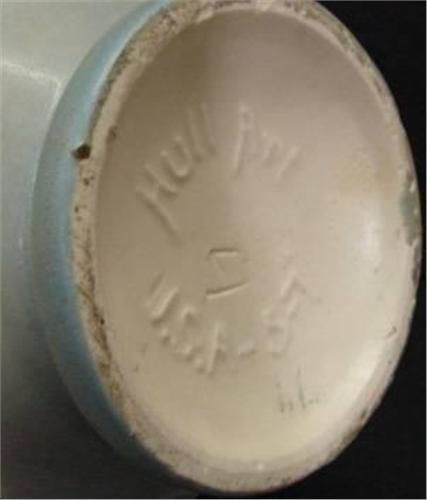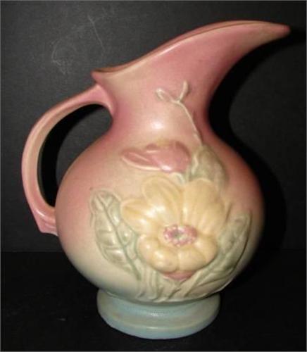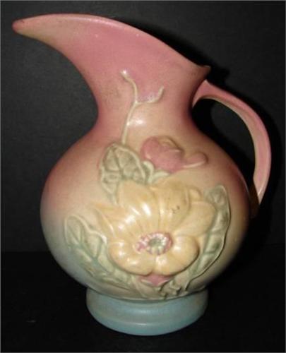 HULL POTTERY MAGNOLIA EWER. Shows a series of small chips along bottom of base. Marked on bottom. 7.5” H