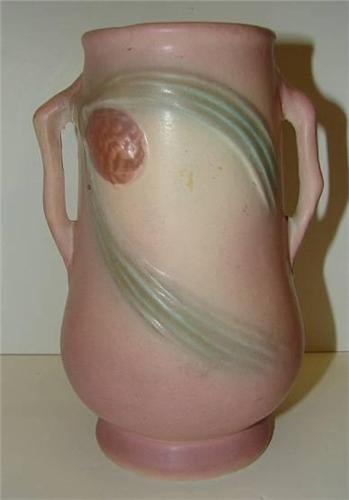 HULL POTTERY PINECONE VASE. Double handles. Shows cracking at top of one handle. Marked illegibly on bottom. 6.5” H
