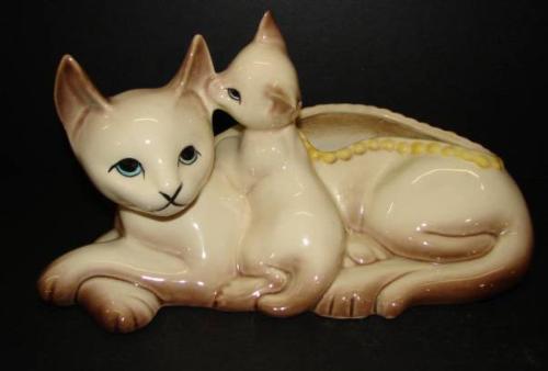 HULL POTTERY (1953) SIAMESE CAT PLANTER. Shows damage to right ear of kitten. Marked on bottom. 6” H