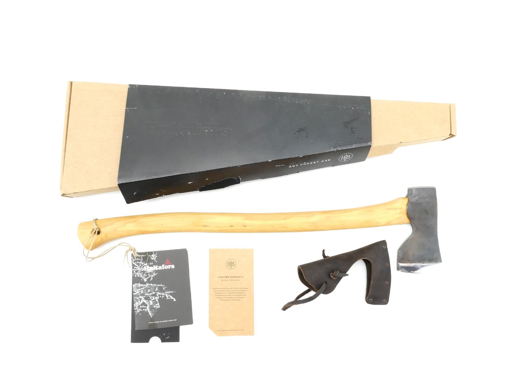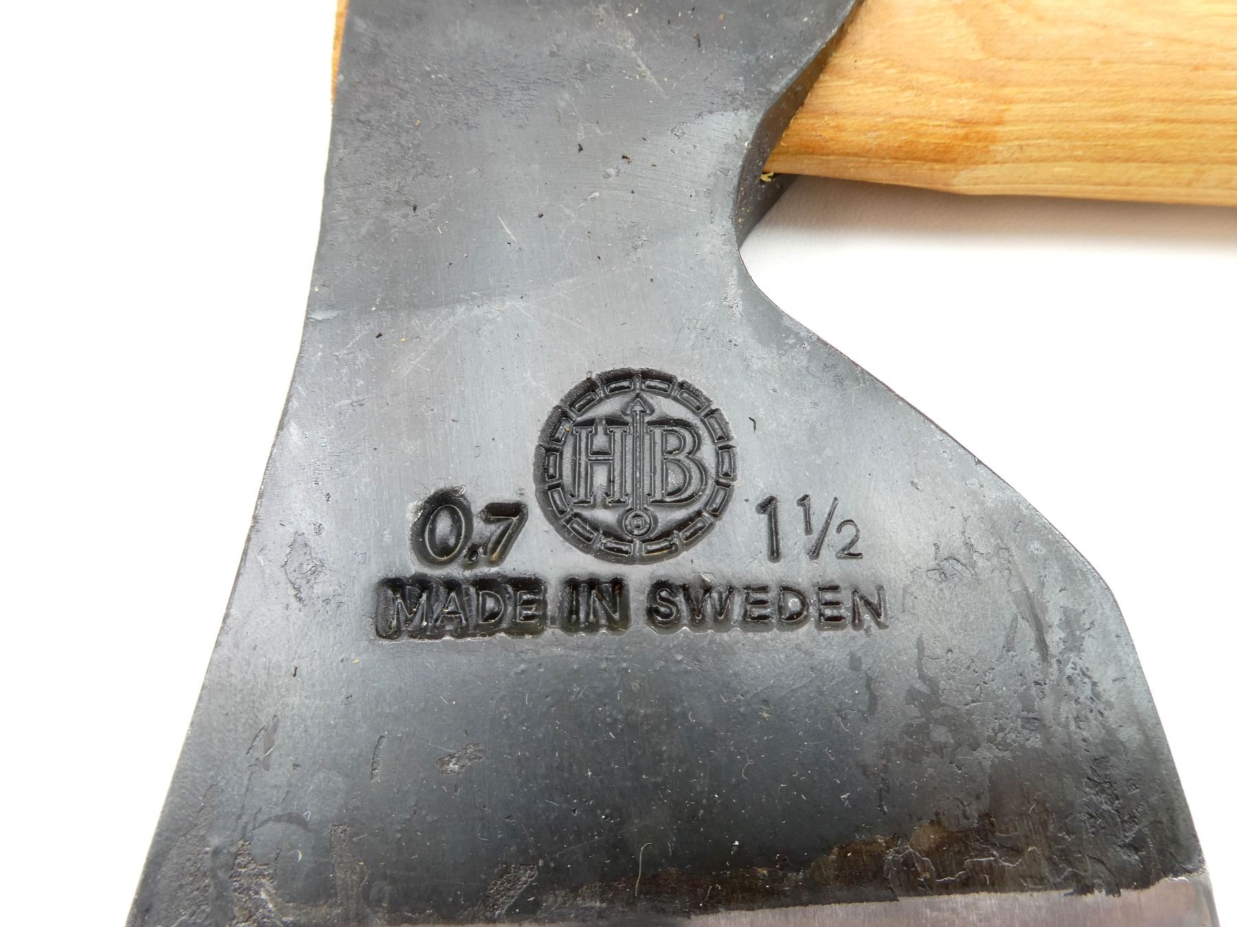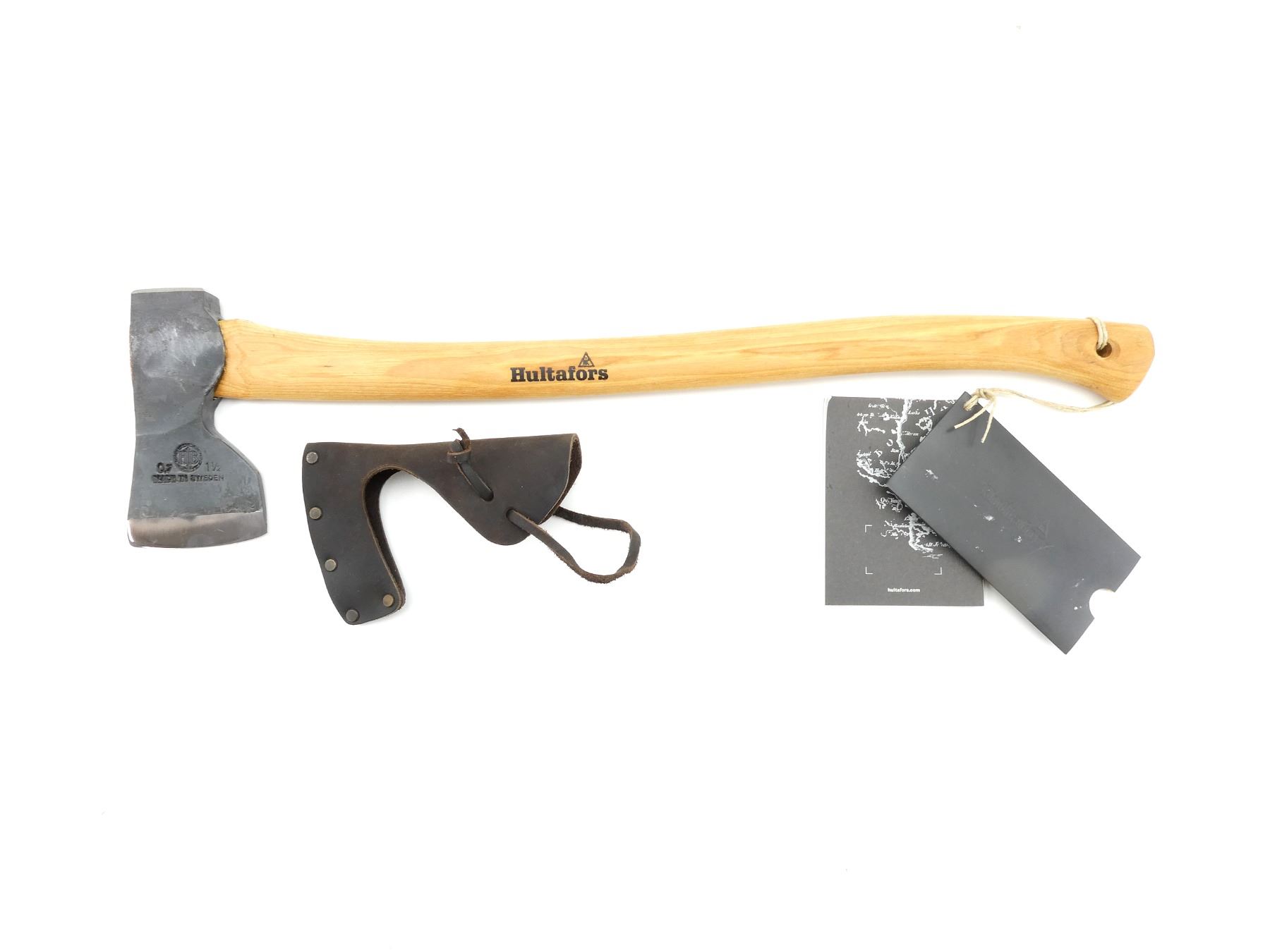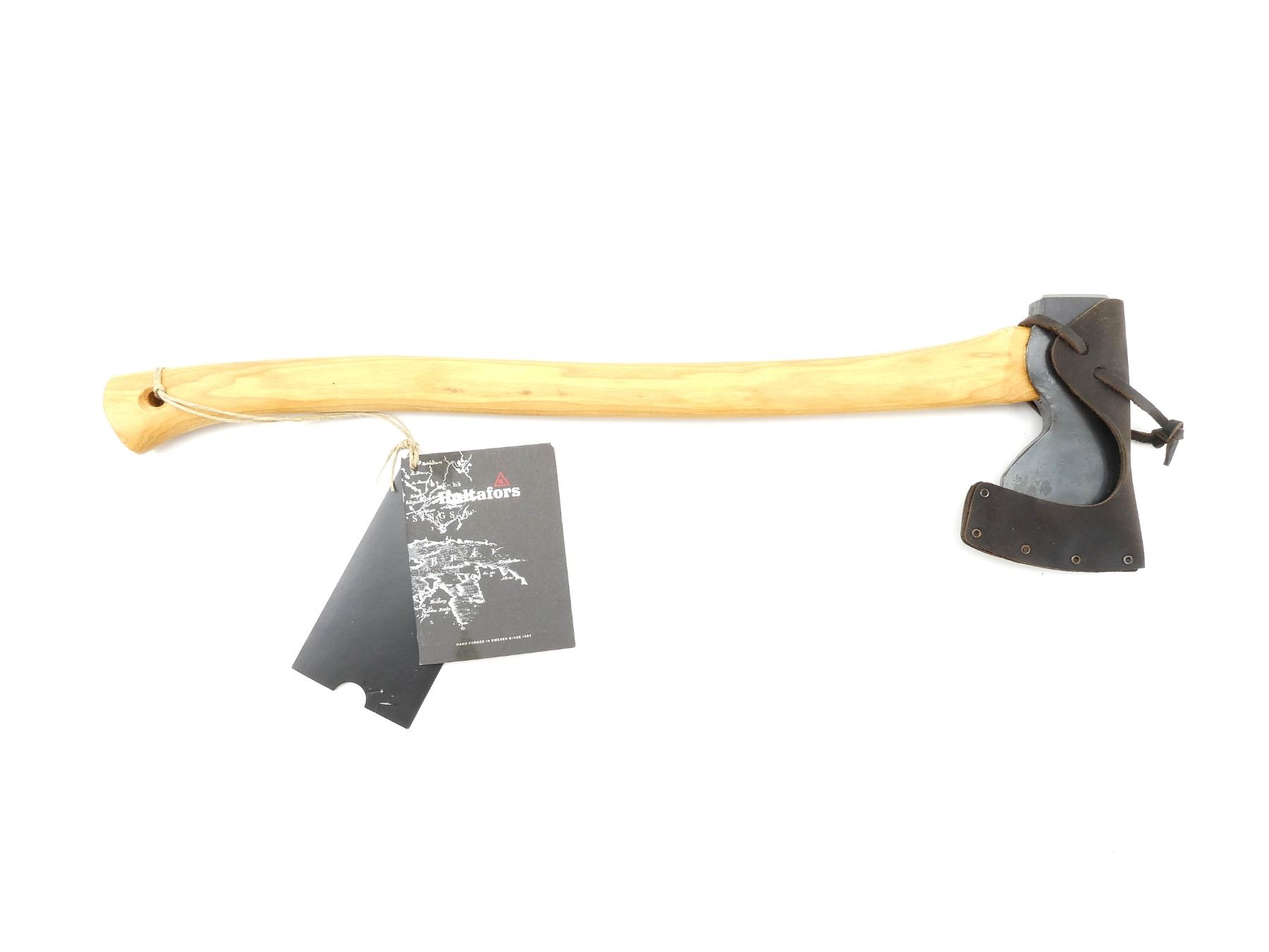 (1) STEEL AXE HEAD, MARKED "0.7", "1 1/2", ETC., WOODEN HANDLE, MARKED "HULTAFORS", WITH LEATHER SHEATH, AXE HEAD OVERALL LENGTH APPROX. 6", OVERALL LENGTH APPROX. 23 3/8", APPEARS NEW OLD STOCK, IN ORIGINAL PACKAGING. SEE PHOTOS.