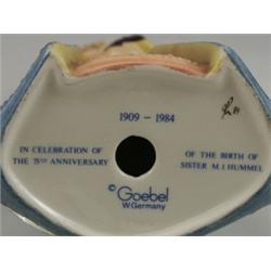 In Celebration of the 75th Anniversary of the birth of Sister M.I. Hummel, 1909-1984. This limited to one year production figurine features the Madonna and Child and is incised 1964. Numbered 364 with Missing Bee Mark, Trademark number 6. Excellent Condit