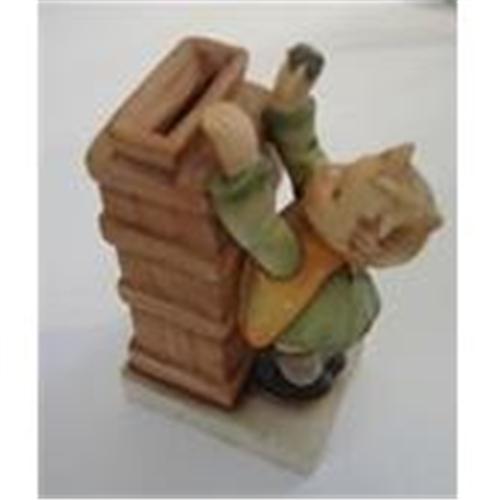 BOOK VALUE $650.00. THIS IS A FAVORITE OF MINE; THE HUMMEL LITTLE THRIFTY BANK WITH ORIGINAL KEY. THE MARK OF THE BEE IN A V WAS THOUGHT TO HAVE BEEN DERIVED FROM A CHILDHOOD NICKNAME OF SISTER MARIA INNOCENTIA HUMMEL MEANING BUMBLEBEE. THE MARK WAS TO HONOR M.I. HUMMEL WHO DIED IN 1946.