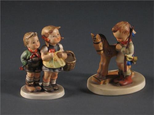 Hummel bisque figurines to include ''To Market'' and scene of boy praying next to a hobby horse; no chips, breaks or repairs. Both 4.25'' H