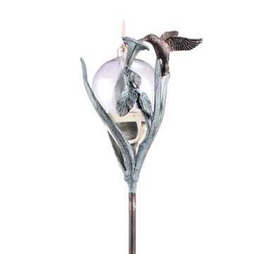 HUMMINGBIRD OIL LAMP AND STAKE - 45.5"H 7"W 6"D -ALUMINUM & GLASS OIL LAMP GARDEN STAKE