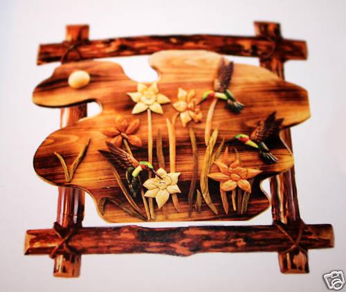 "HUMMINGBIRDS" - 24X24 - HAND CARVED - HAND STAINED - MADE OF MANY DIFFERENT HIGH QUALITY WOODS - WELL MAINTAINED - QUALITY