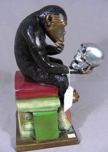 A seated monkey holds one hand to chin and holds a skull in other. He appears to be in deep thought. Multi colored patina. Fine detail. 15 1/2" high.