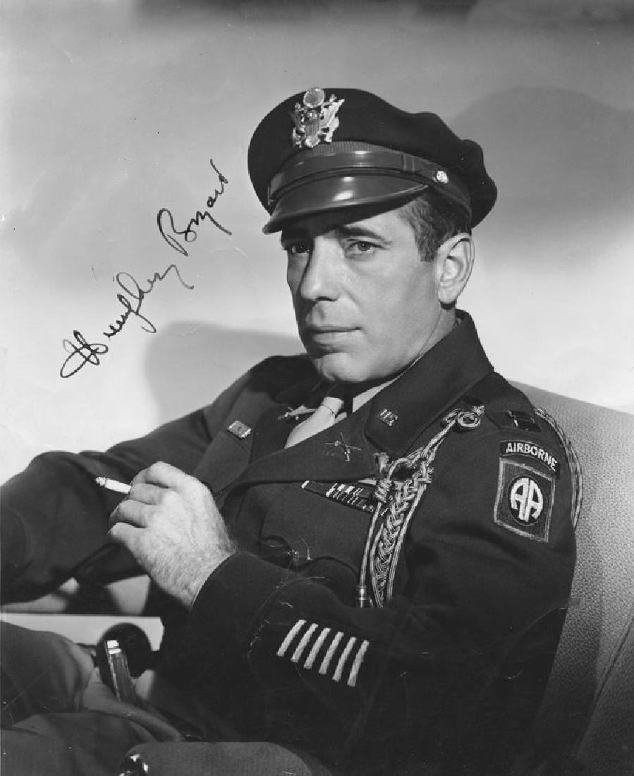 Black and white, half lenght photograph of Bogart in an airborne officer's uniform holding a cigarette, signed by Humphrey Bogart. 10x8 inches.