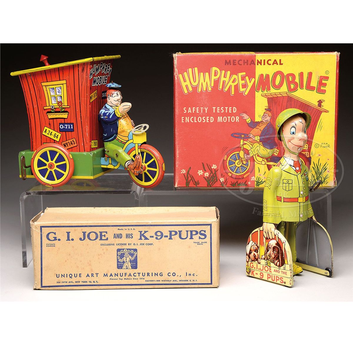 1) Mechanical "Humphreymobile" No. 875 in original box by Wyandotte. All tin lithographed toy with windup action rolls forward with "Humphrey" pedaling and waving as hat moves. Highly graphic box shows comic strip from which Character was derived. 2) "G. I. Joe and His K-9-Pups" by Unique Art Mfg., Newark, NJ. All tin G. I. Joe in soldier's outfit walks forward with pup cages to sides. SIZE: Largest 9" t. CONDITION: Great examples of both toys - near excellent to near mint and working. Boxes are very good. 1-13277