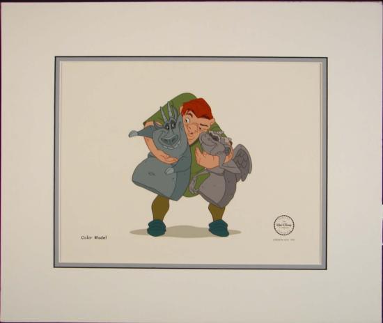 This RARE hand-inked, hand-painted Color Model portrays Quasimodo and his gargoyle friends, Laverne and Hugo. This color model is a one-of-a-kind and was used as the prototype for 5000 edition sericel that has now sold out!! This item includes a cel and mat. A very unique find for any Disney enthusiast!!