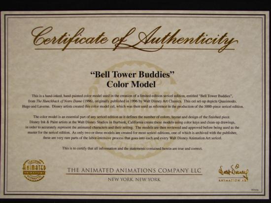The color model is an essential part of any sericel edition as it defines the number of colors, layout and design of the finished piece. Disney Ink & Paint artists at the Walt Disney Studios in Burbank, California create these models using color keys and clean-up drawings, in order to accurately represent the animated characters and their setting. The models are then reviewed and approved before being used as the master for the sericel edition. As only two or three models are created for most sericel editions, one of which is archived with the publisher, these are very rare parts of the labor-intensive process that goes into each and every Walt Disney Animation Art sericel."
