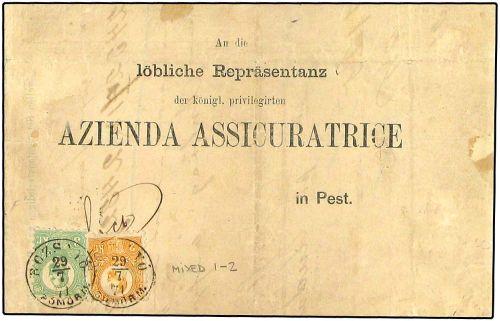 1871 (July) Cover with printed address to PEST franked by rare LITHO 3 kr. green and ENGRAVED 2 kr. orange yellow tied by POZSNYO cds¦s with PEST arrival on reverse. A rare mixed franking cover and an early usage. Sc 2, 7.