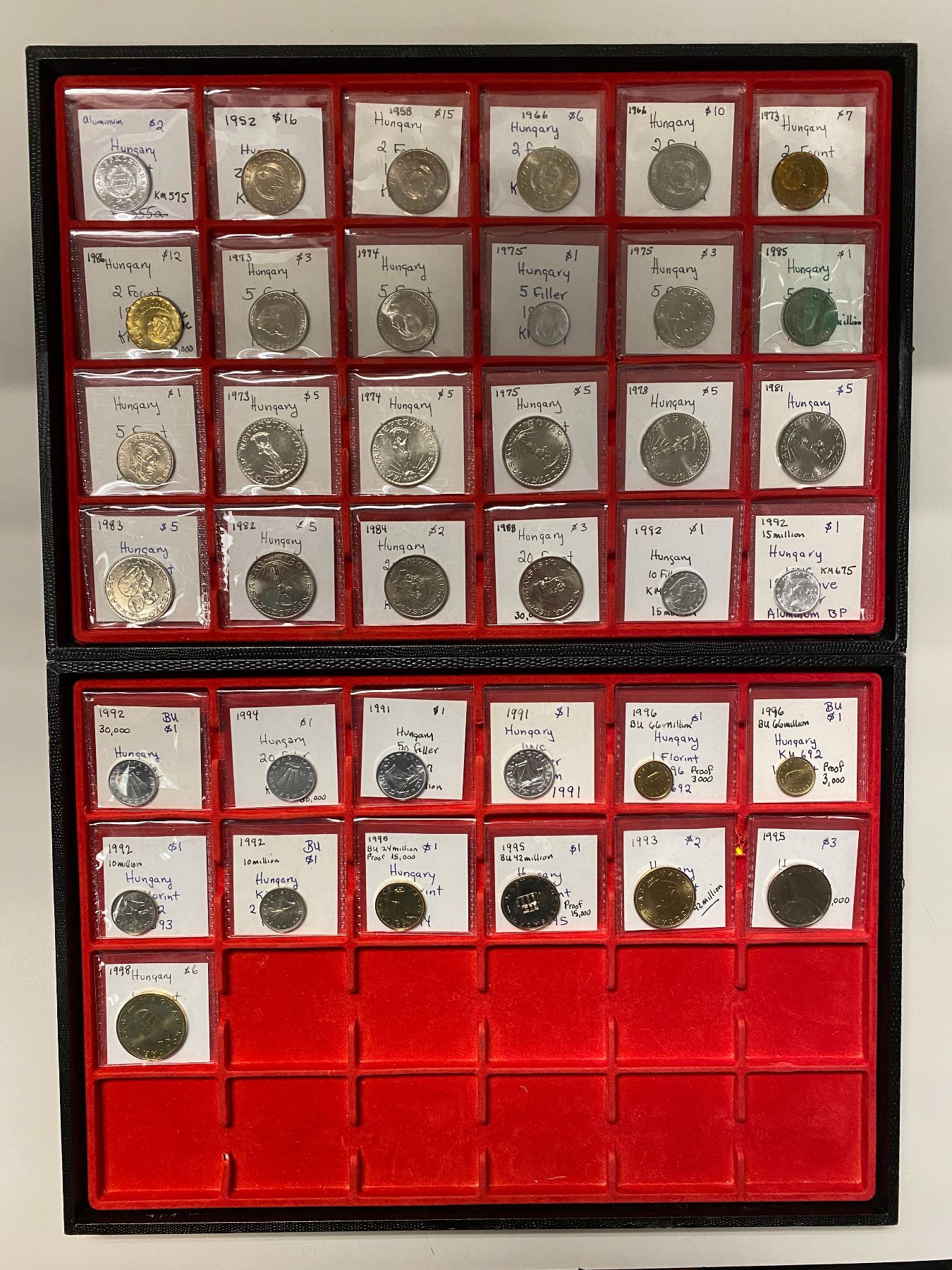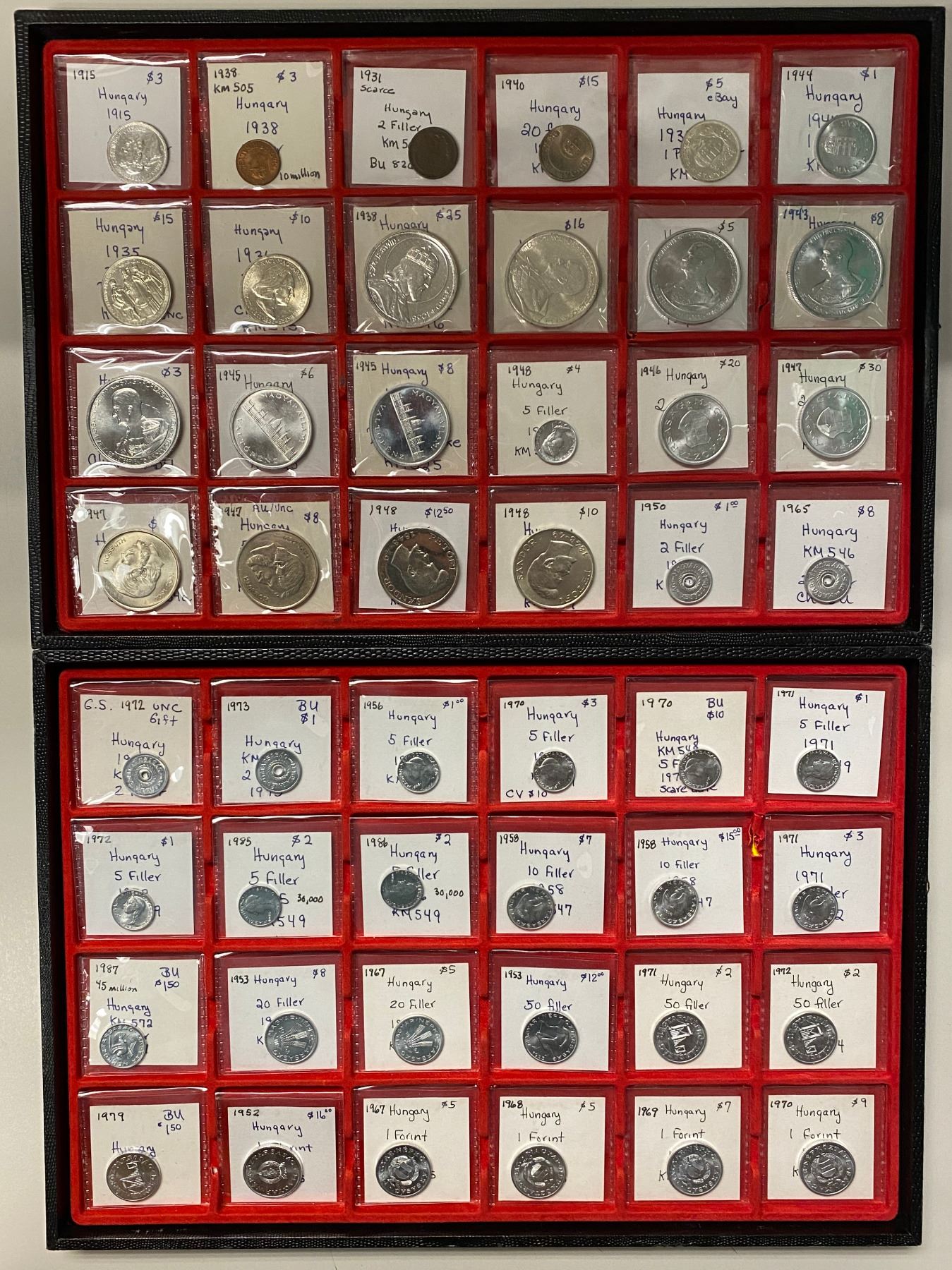 HUNGARY: LOT of 84 coins, a collection of mostly different coins including; Kingdom silver 1 korona 1915, Regent Era 1 filler 1938, 2 filler 1931, 20 filler 1940, silver 1 pengo 1939, 1 pengo 1944, silver 2 pengo Pázmány University, 1936 Death of Franz von Liszt, silver 5 pengo 1938 Death of St. Stephan, 1939 Birthday of Miklós Horthy, 5 pengo 1943 75th Birthday of Admiral Miklós Horthy (3), Provisional Government 5 pengo 1945 (2), Republic, 5 filler 1948, 2 forint 1946, 1947, silver 5 forint 1947 (2), 1948 (2), People's Republic 2 filler 1950, 1965, 1972, 1973, 5 filler 1956, 1970 (2), 1971, 1972, 1986, 1986, 10 filler 1958 (2), 1971, 1987, 20 filler 1953, 1967, 50 filler 1953, 1971, 1972, 1979, 1 forint 1952, 1967, 1968, 1969, 1970, 1989, 2 forint 1952, 1958, 1966 (2), 1973, 1986, 5 forint, 1973, 1974, 1975 (2), 1985, 1988, 10 forint 1973, 1974, 1975, 1978, 1983, 1991, 1982, 20 forint 1984, 1988, Republic 10 filler 1992 (2), 20 filler 1992, 1994, 50 filler 1991 (2), 1 forint 1996 (2), 2 forint 1992 (2), 5 forint 1995, 10 forint 1995, 20 forint 1993, 50 forint 1995, 100 forint 1998, earlier dated coins are mostly AU and later issues are UNC or proof restrike, retail value $450, lot of 85 coins.
