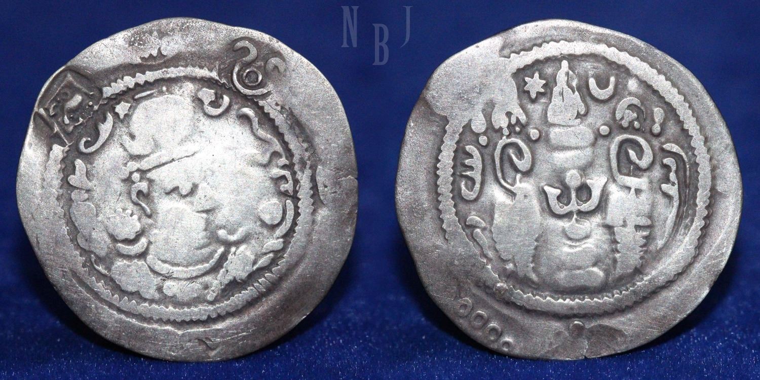 HUNNIC TRIBES: in Baktria and Sogdiana, Imitation of Hormizd IV, 790 to 810 AD. AR Drachm. Obverse: Sasanian-style bust turning right, three different countermarks on the outer ring, reverse: Fire altar with attedants, imitation pahlavi letters "Bish" (mint Bishapur), and date 11 with imitation of pahlavi letters. (3.11gm, 31mm) Choice Very Fine. Lightly Toned. Extremely Rare.
