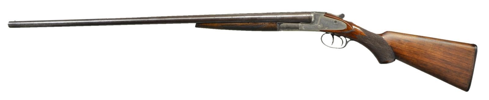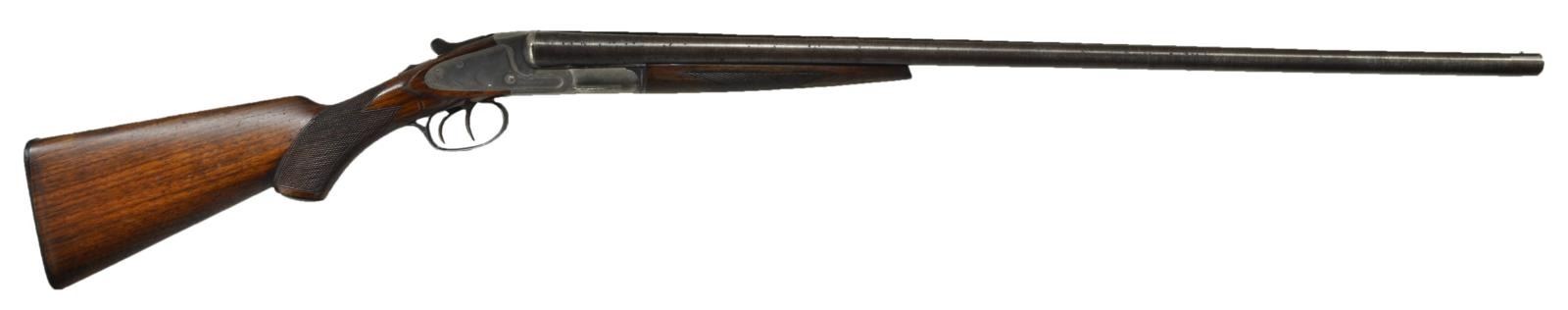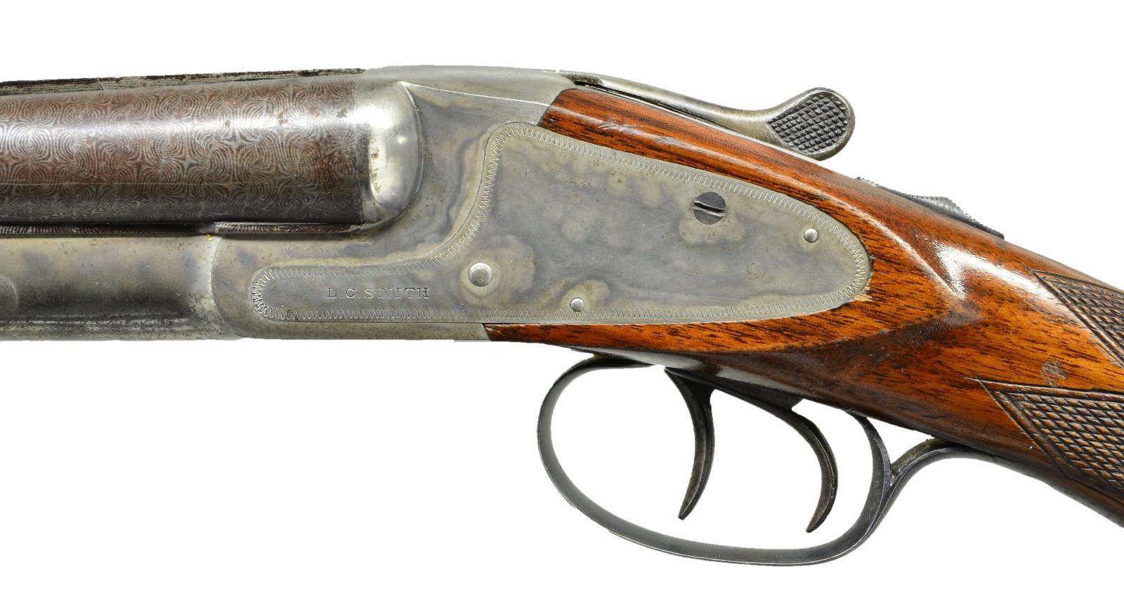 SIDE SHOTGUN. Cal. 16 Ga. 2 3/4". S# 65671. The 30" two stripe Damascus bbls. are marked w/ Hunter info on rear portion of slightly raised concave matted rib. Grade & S# are on bbl. flats. Case hardened standard weight action w/ rotary bolt features automatic safety & dbl. triggers. Lockplates, triggerplate & trigger guard have some wiggle engraved borders. "L. C. Smith" is on each lockplate. Capped pistolgrip buttstock of plain American walnut measures 14 1/4" over checkered hard rubber buttplate. Point pattern checkering is at grip. Matching splinter forend has J-spring release. MEASUREMENTS: BBLS: Bore Diameter: .657", R L .658". Restriction: R .025" (MOD), L .030" (FULL). Min. Wall Thickness: R .022", L 024.". STOCK: DAH: 3 3/8". DAC: 1 15/16". LOP: 14 1/4". CAST: neutral. WEIGHT: 6 lb 9 oz. CONDITION: fine, bbls. retaining about 70% original Damascus finish w/ considerable spotting & associated light pitting, mostly on top & breech area. Action & lockplates retain a considerable amount of original case hardening color which shows overall fading. Triggerguard has traces of original blue. Stocks retain some of their original varnish. Butt shows refinishing & some losses w/ installation of later buttplate which is not well fitted. Checkering considerably worn especially on forend. Grip checkering recut. Bores are bright & shiny w/ some light frosting. Left bbl. shows a fairly sharp dent 9" from breech end at top. Action is tight. (22-4064/MGM). CURIO. $500-700.
