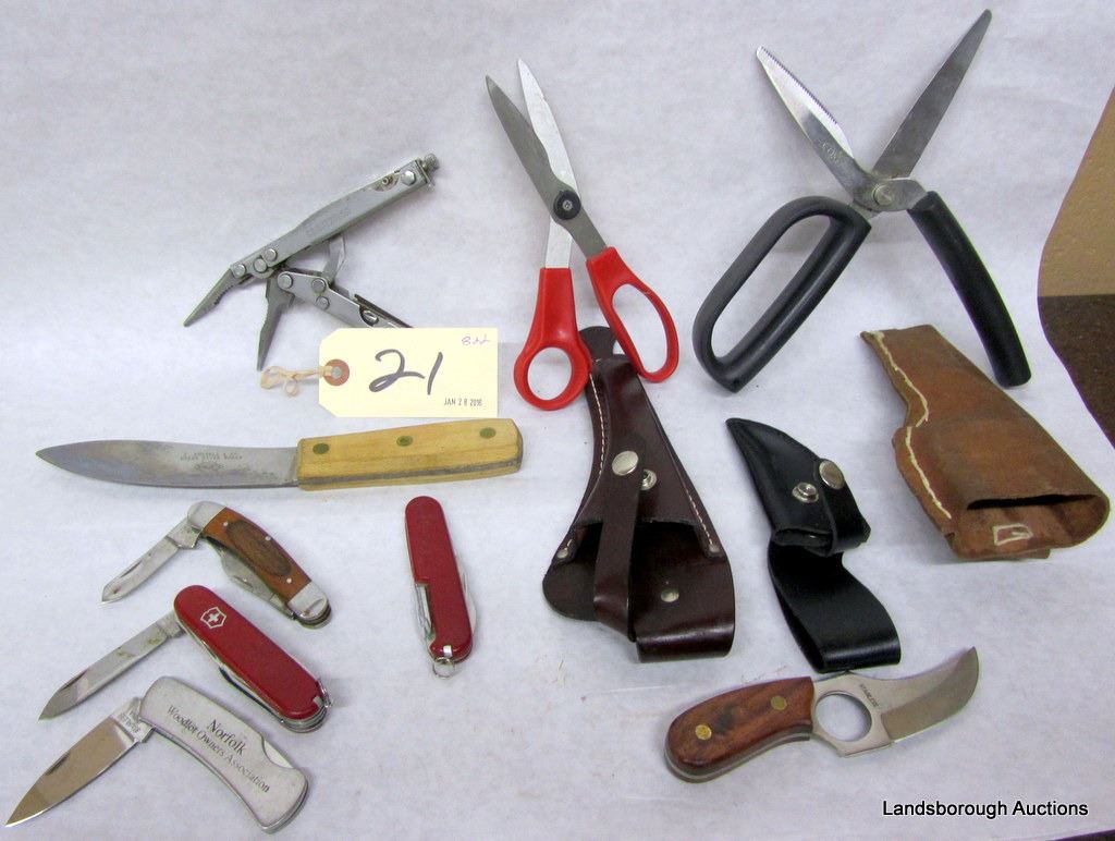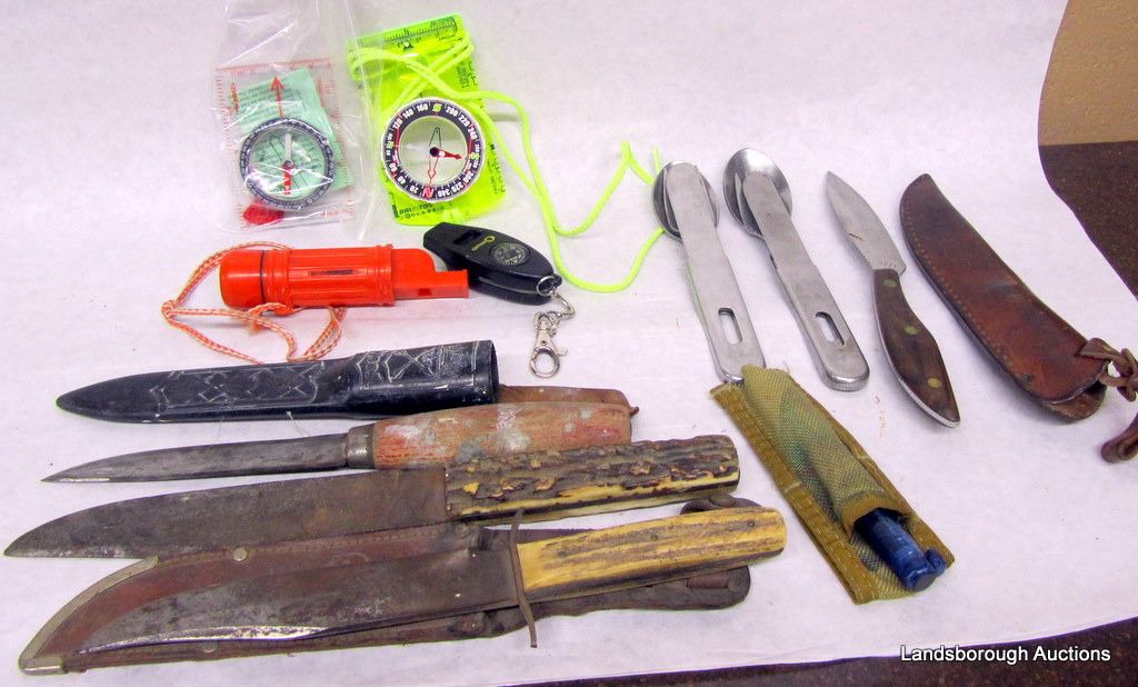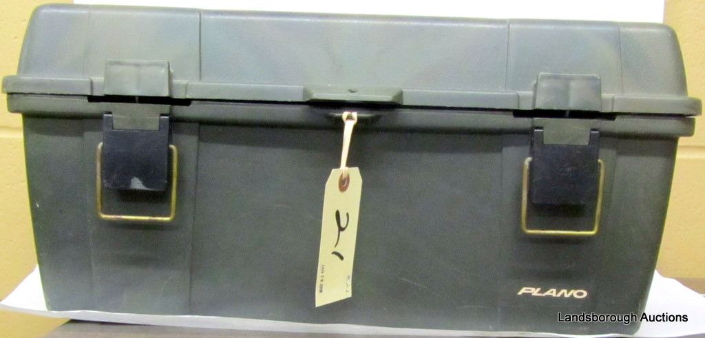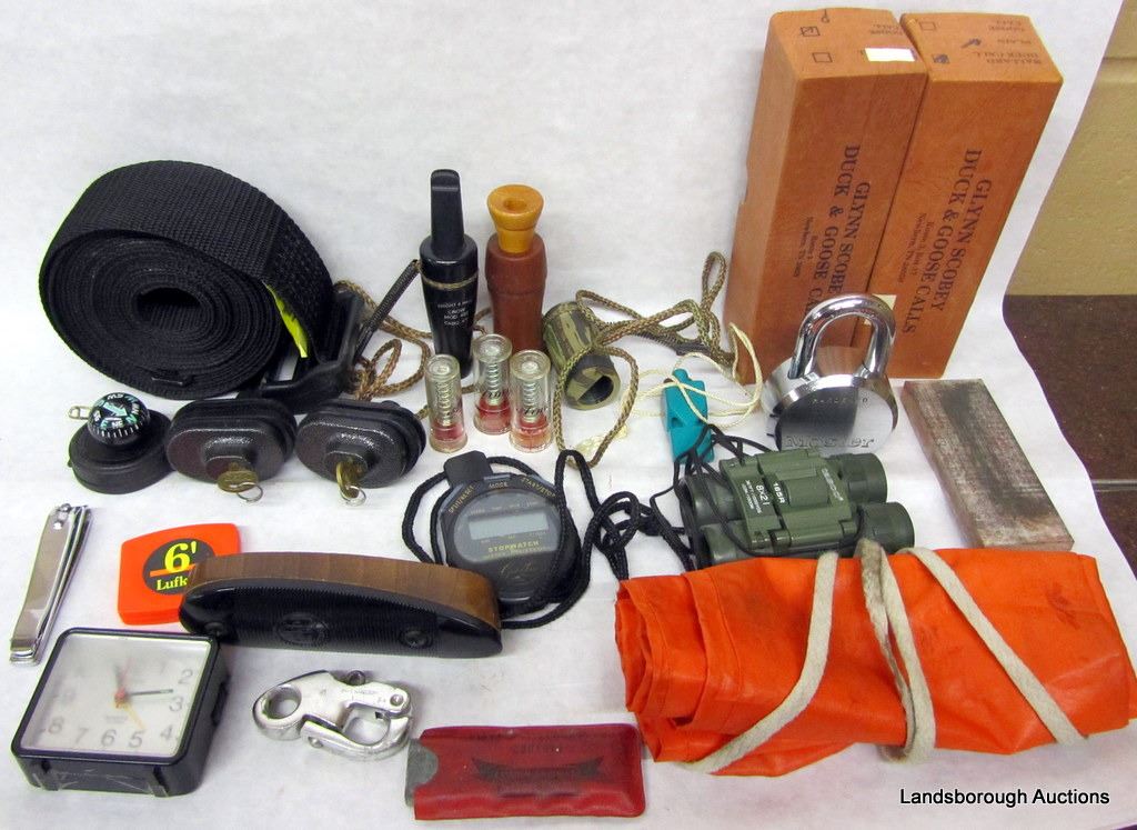 PLANO TOOL BOX CONTAINING CALLS, LOCKS, SHARPENING STONES, SNAP CAPS, GUN SOCK, STOP WATCH, TASCO BINOCULARS, BERETTA BUTT PLATE, FOX WHISTLE, COMPASSES, SCISSORS, MULTI TOOL, POCKET KNIVES, SKINNING KNIVES, CAMPING UTENSILS, BUCK KNIVES.