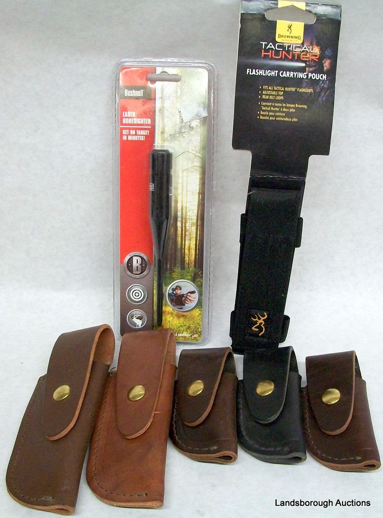 FIVE LEATHER KNIFE SHEATHS, BUSHNELL BORE SIGHTER, BROWNING TACTICAL FLASHLIGHT POUCH.