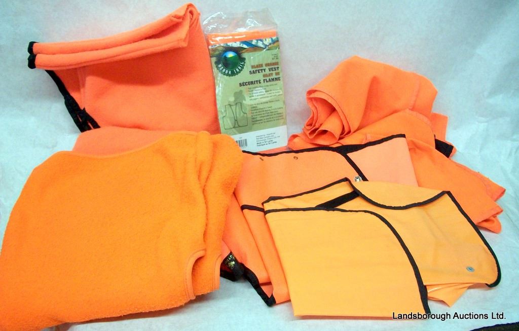 EIGHT BLAZE ORANGE HUNTING VESTS - FLEECE AND NYLON. FLEECE CAMO JACKET XL AND FLEECE BLAZE ORANGE PULLOVER XL.