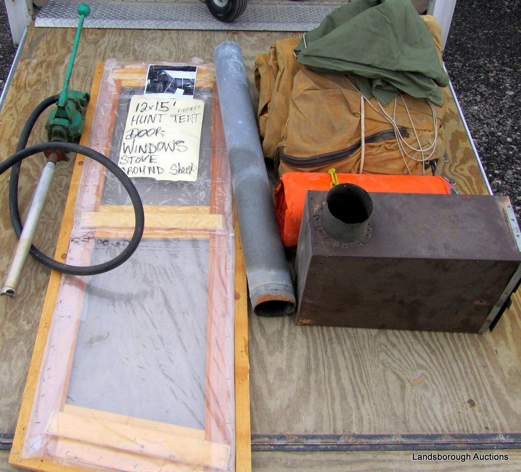 CANVAS TENT WITH GROUND SHEET, DOOR, WINDOWS, WOOD FRAME, STOVE AND PUMP. APPROX 12 FT X 15 FT.