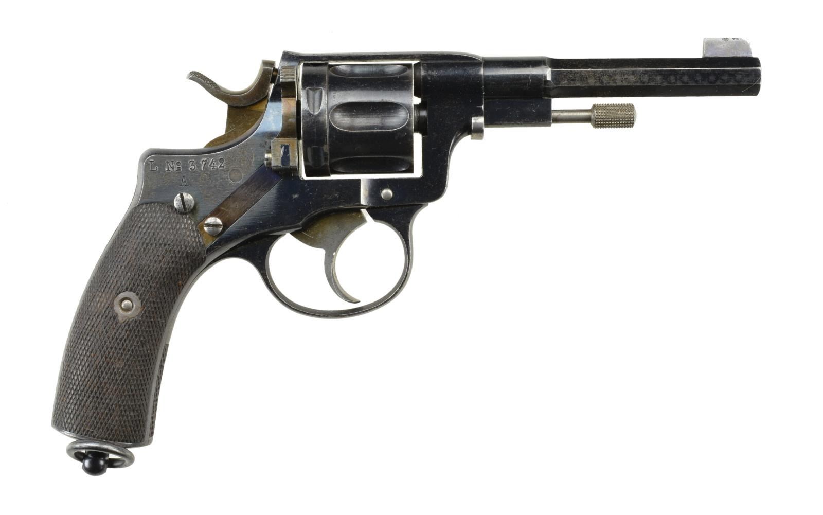 Cal. 7.5x22mmR. S# 10199. Bbl 4 1/2". Matching numbers on bbl., loading gate, cyl. pin lock, trigger & frame. Left side of frame marked "HUSQVARNA/S #/HR". Right rear of frame marked "L NO 3742/A". Checkered walnut grips. CONDITION: walnut grips show some dents, flattened areas & handling wear. Loading gate, hammer and trigger show strong straw finish w/ light oxidation. Balance of metal retains 70% original blue w/ a small spot of light pitting on cyl., scattered thinning, scratches & a few spots of freckling. Good bore w/ scattered frosting & a few spots of light pitting. (22-2400/MJC). CURIO. $300-400.