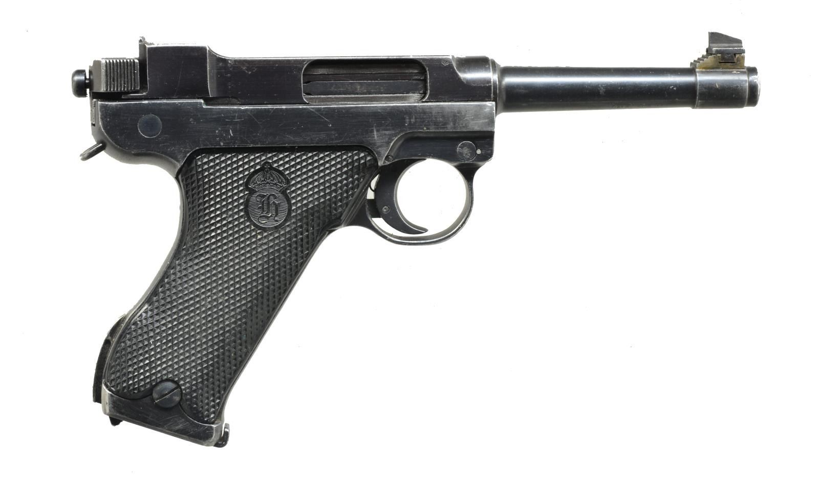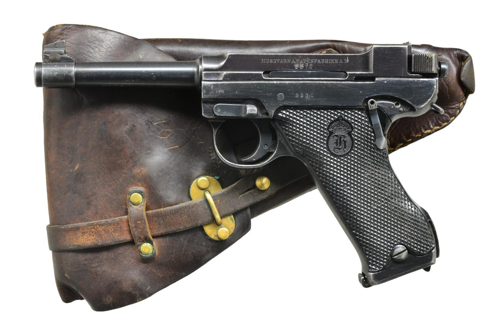 Cal. 9mm Luger. S# 3370. Bbl. 5". CAI import mark on underside. Adopted 1942 as standard military firearm. Production ceased 1946 after 84,000 units. Matching numbered receiver & bolt. Checkered logo, plastic grips, stock lug & lanyard loop. MAGS: 3 factory 8 rd. UNATTACHED ACCESSORIES: matching good military holster w/ 3 crowns on front of flap. Includes loading tool & cleaning rod plus provision for 2 spare mags. Front of flap scratched "101". CONDITION: good to very good over all appearance w/ light marks & high point wear likely from holstering. Very good grips. good to very good bore w/ frosting & light pitting. (20-3043/NW). CURIO. $500-750.