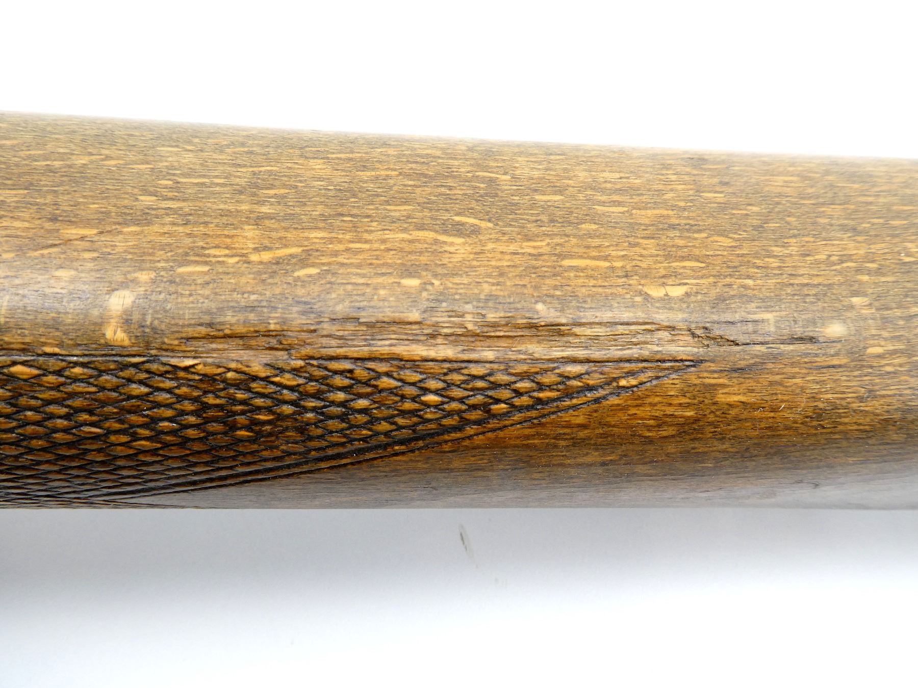 (1) WOODEN STOCK, RIGHT HANDED, CHECKERED, PISTOL GRIP WITH CAP, BLACK POLYMER BUTT PLATE, REAR SLING SWIVEL, SHOWS SMALL CHIPS / CRACKS / WEAR, CRACKED AT WRIST, OAL APPROX. 32.5". MAY REQUIRE FITTING. SEE PHOTOS.